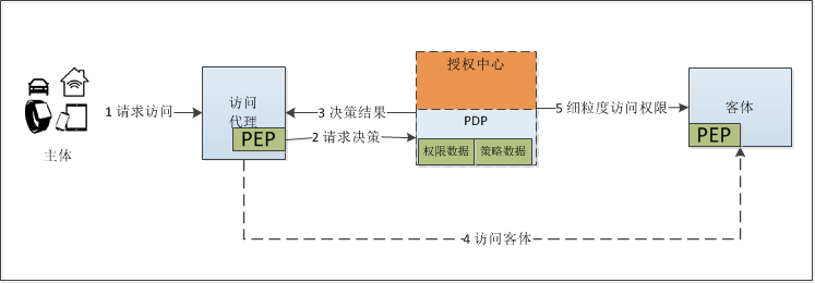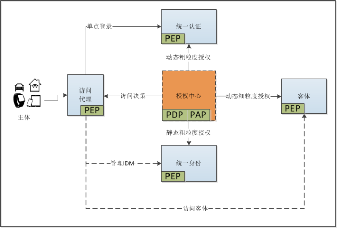 主体访问客体前进行单点登录,即身份验证,统一认证平台通过PEP获取动态粗粒度的权限,对身份进行验证;访问代理通过PEP进行访问决策;决策通过后允许访问客体,客体再通过PEP获取动态的细粒度功能权限,从而实现细粒度授权的访问控制。