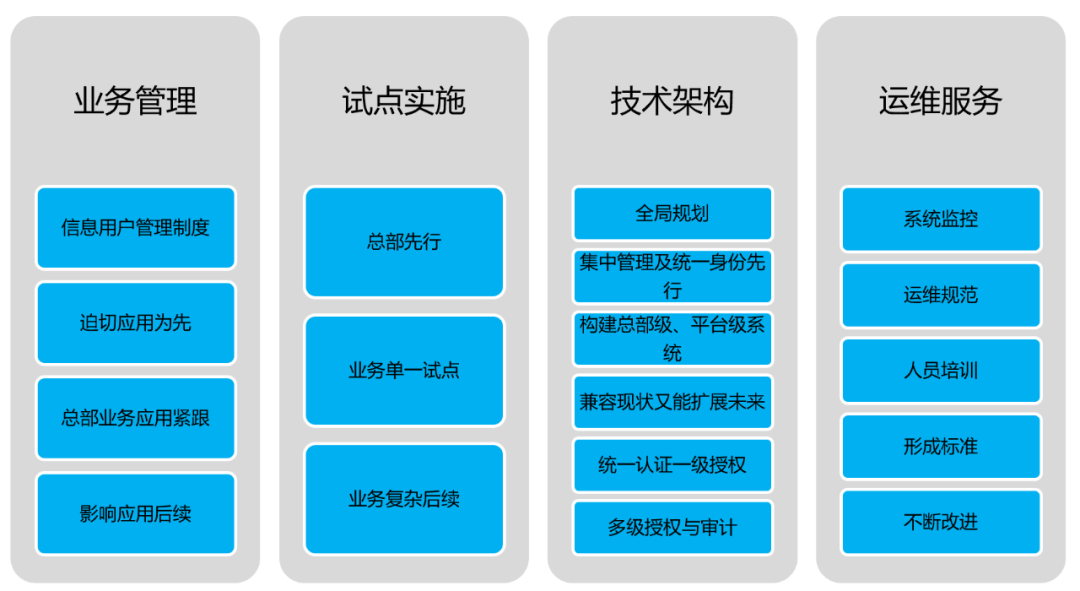 身份治理规划需要考虑统一规划、分布实施战略,其设计原则遵循先易后难、先见成效后推广、先试点再全面铺开方式开展。