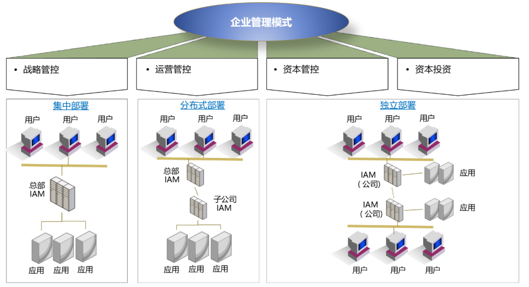 1) 集权管控模式:主要针对集团集中管理模式,身份治理平台需要考虑集中部署方式;