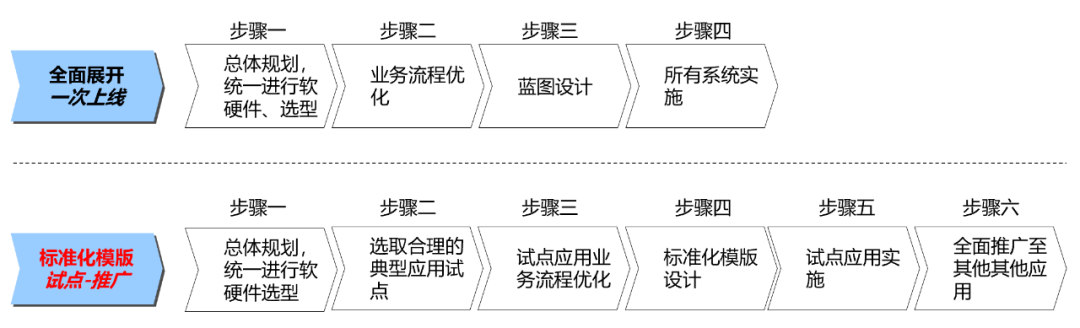 身份治理规划推广策略分为全面铺开和试点推广策略,结合实际管理与运维模式,建议采用标准化模版试点推广方式,此推广策略可更好进行项目风险管控和进度管控。