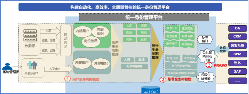 打通企业上下游系统的对接,最终实现用户全生命周期自动化管理,从而避免管理员过多的手工干预,在保证数据准确性的同时提高效率。