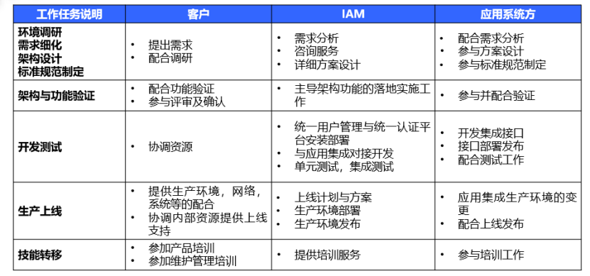IAM统一身份管理平台落地,不单单是系统集成这么简单,完整的项目落地,包含前期的调研,需求确认、方案设计(规划统筹结合客户实际情况给出合理的方案),具体功能实现、集成联调、上线、以及平台上线后的运营及推广办法,另外针对不同的行业,调研的侧重点可能不一样,都需要有针对性的设计相应的关注点、从系统调研结束,到功能需求的实现落地,到功能测试联调,上线,试运行等一系列工作,通常这个项目持续周期在12—16周区间。