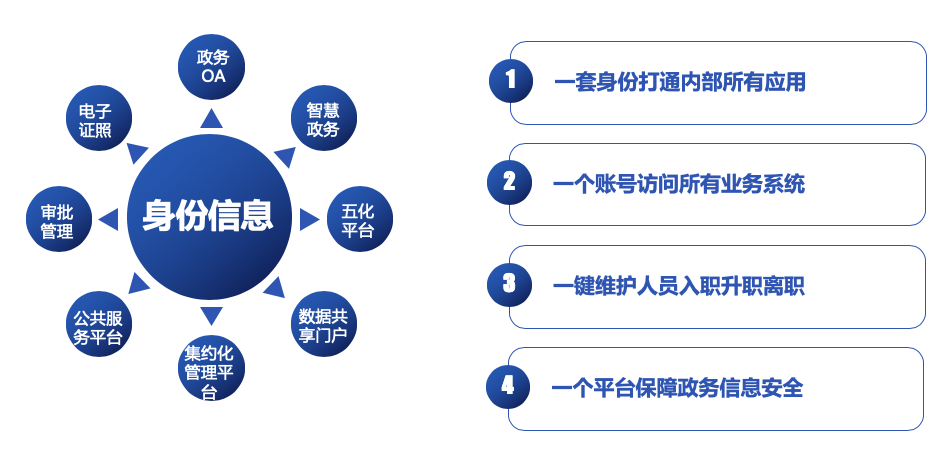 随着“政务+互联网”的推进,各级政府部门在信息化建设方面的投入越来越多,也越来越依赖各种如电子邮件系统、网络办公、电子财务、人事管理,以及与政府部门特定职能相关的业务系统等。所有这些系统都牵涉到众多用户账号的管理,少则以十计,多则以万计,不同系统下账户的创建、分配、重设、注销可能是电子政务信息系统管理部门日常工作的一个重要组成部分。另一方面,系统用户需要随时使用自己的账号信息访问上述系统,并在多套系统之间切换。