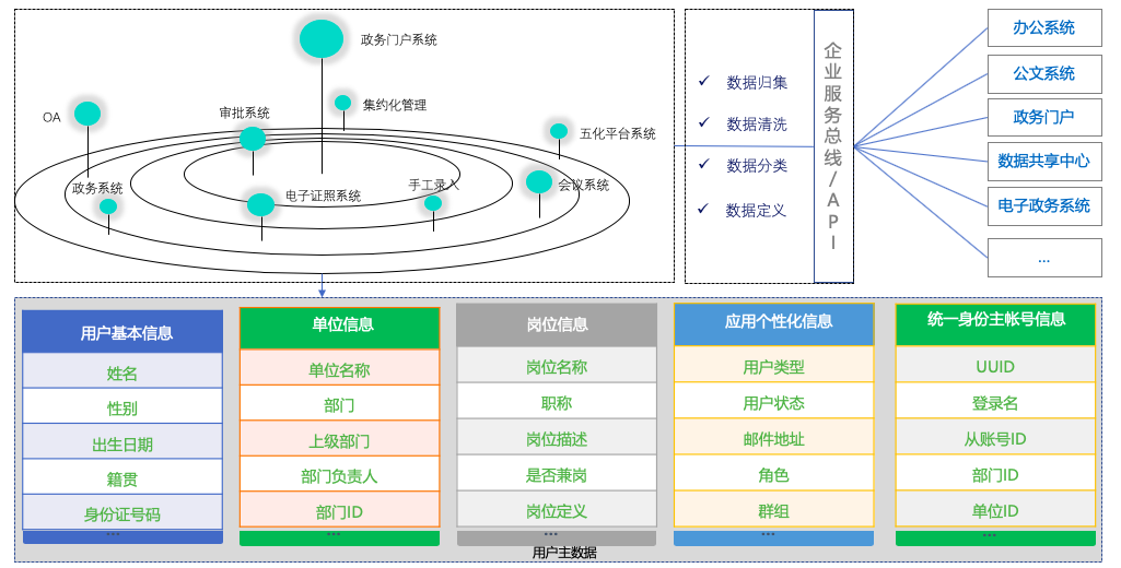 政务系统的用户数据梳理、数据归集、依据政务机关单位及职能的分类定义,形成集中统一的用户、法人单位、岗位信息主数据。