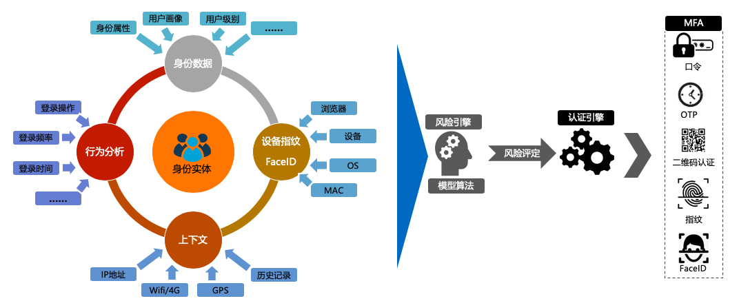 持续动态风险控制,利用大数据技术和AI算法,结合全面的身份“实体”数据,通过用户行为分析、访问途径上下文、设备指纹/FaceID建立风险引擎,引入风险模型算法,根据用户访问习惯、特征判别风险等级,智能化身份识别验证。